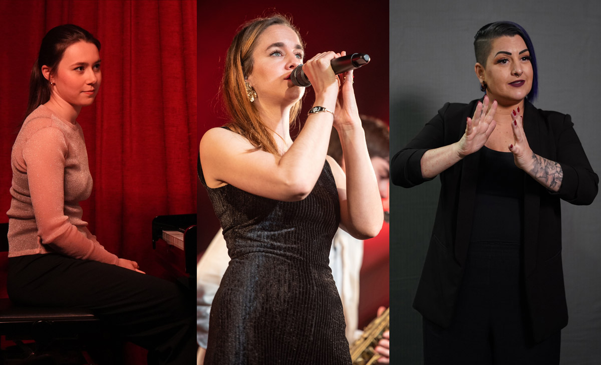 An diesem Abend wird der Ausstellungsraum von Daniela Keiser zu einer Konzertbühne: Die zwei Gebärdensprach-Dolmetscherinnen Barbara Rossier und Corinne Leemann interpretieren den Gesang von Lisa Arter und das Pianospiel von Viviane Gloor und machen diese für alle Sinne erfahrbar.